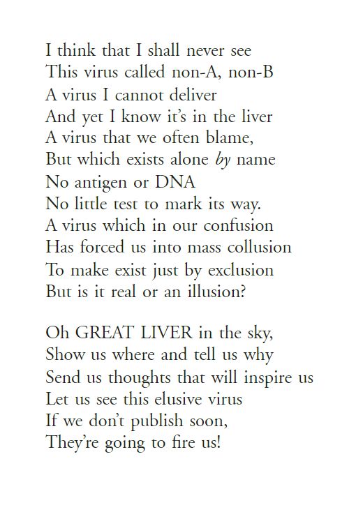 丙肝病毒的發(fā)現(xiàn)過程充滿了曲折,在第一次發(fā)現(xiàn)丙肝感染病例之后,科學家們花了十余年時間的努力以圖分離、辨別致病病毒而無果,只能稱之為“非A、非B型”肝炎,逼得當時的Harvey Alter為此而創(chuàng)作了一首吐槽詩: