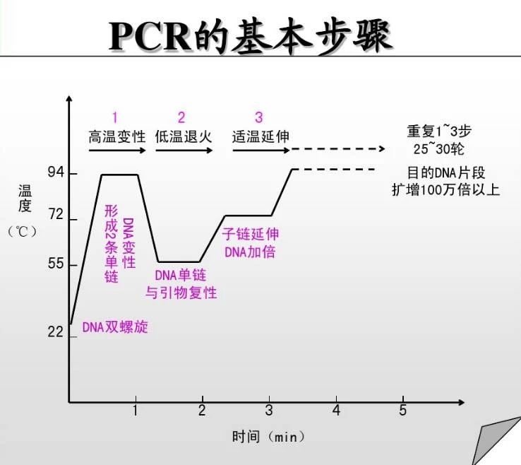 PCR又稱聚合酶鏈反應(yīng),是體外擴(kuò)增目的DNA片段的方法,在多方面廣泛應(yīng)用,主要分為三大步驟:高溫變性、低溫退火、適溫延伸。分別添加引物、模板、Taq酶、dNTP和緩沖液等反應(yīng)物混合,在約為95℃環(huán)境下,雙鏈DNA氫鍵斷裂解旋為單鏈;單鏈與人工設(shè)計(jì)的引物在約為60℃溫度下,按照堿基互補(bǔ)配對(duì)的原則相結(jié)合;并升溫到72℃左右,利用Taq酶延伸合成一條新的與模板DNA鏈互補(bǔ)的半保留復(fù)制鏈。