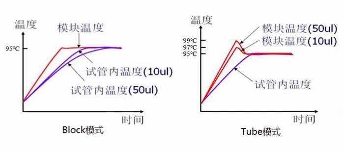 另外,很多PCR儀在加熱模式上有Tube、Block兩種方式可選。這是因?yàn)閮x器的溫度傳感器在模塊下部,實(shí)際上無法測(cè)得樣品管內(nèi)的溫度。一般情況(Block)下,在輸入設(shè)定溫度及運(yùn)行時(shí)間時(shí),指的是模塊在到達(dá)指定溫度下持續(xù)相應(yīng)的時(shí)間,樣品管的溫度不能迅速達(dá)到指定的溫度;而Tube模式是先將模塊溫度高于設(shè)定溫度,等樣品管溫度到達(dá)指定溫度,再將模塊溫度降到指定溫度,這樣能快速使管內(nèi)溫度達(dá)到設(shè)定值。不同反應(yīng)體積和要求可使用不同的模式:普通PCR或體積較大使用Tube模式,當(dāng)長時(shí)間保溫且對(duì)溫度過沖要求較高或是體積較小時(shí),可以使用Block模式。