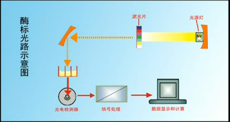不同的光源發(fā)射出特定的發(fā)射光透過載物的微孔板、光的一部分被物質(zhì)吸收,從而前后光的強(qiáng)度發(fā)生變化,這種特異性的強(qiáng)度變化與被測物濃度呈一定比例關(guān)系,能夠定量、定性地檢測結(jié)果。該儀器操作簡單,技術(shù)成熟,但靈敏度不高,當(dāng)需要測定不同波段時(shí),需切換不同光源。