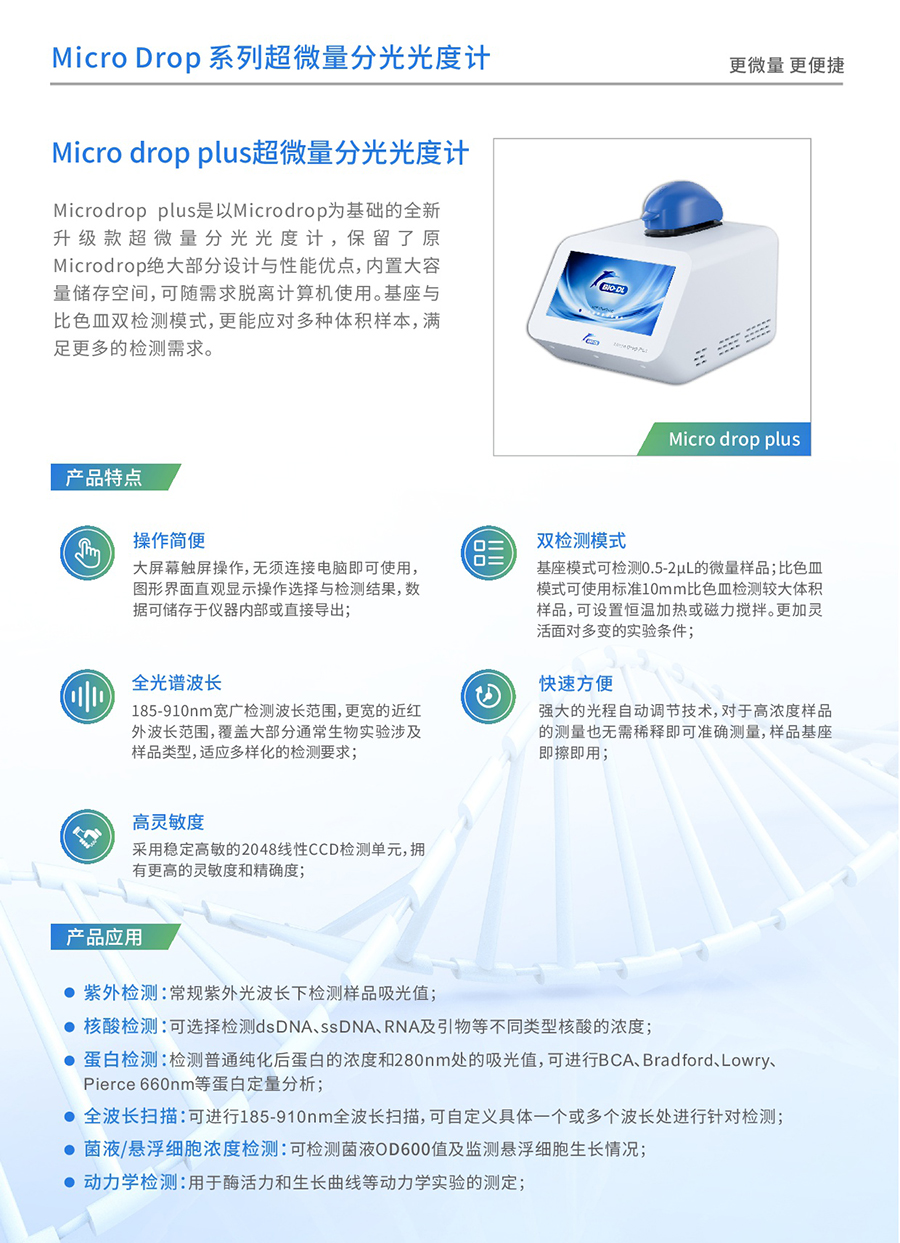 Microdrop plus超微量分光光度計(jì)是寶予德Microdrop的升級(jí)款,體積小巧,方便放置于各種空間能快速準(zhǔn)確地檢測(cè)微量(0.5-2uL)樣品中目標(biāo)物質(zhì)的吸光值,波長(zhǎng)掃描范圍廣,通過其寬闊的觸摸屏可以輕松簡(jiǎn)單地進(jìn)行操作。它具有多種檢測(cè)模式,能夠輕松應(yīng)對(duì)不同檢測(cè)實(shí)驗(yàn)室中對(duì)樣本中DNA/RNA/蛋白質(zhì)等生物分子物質(zhì)的吸光度檢測(cè)。